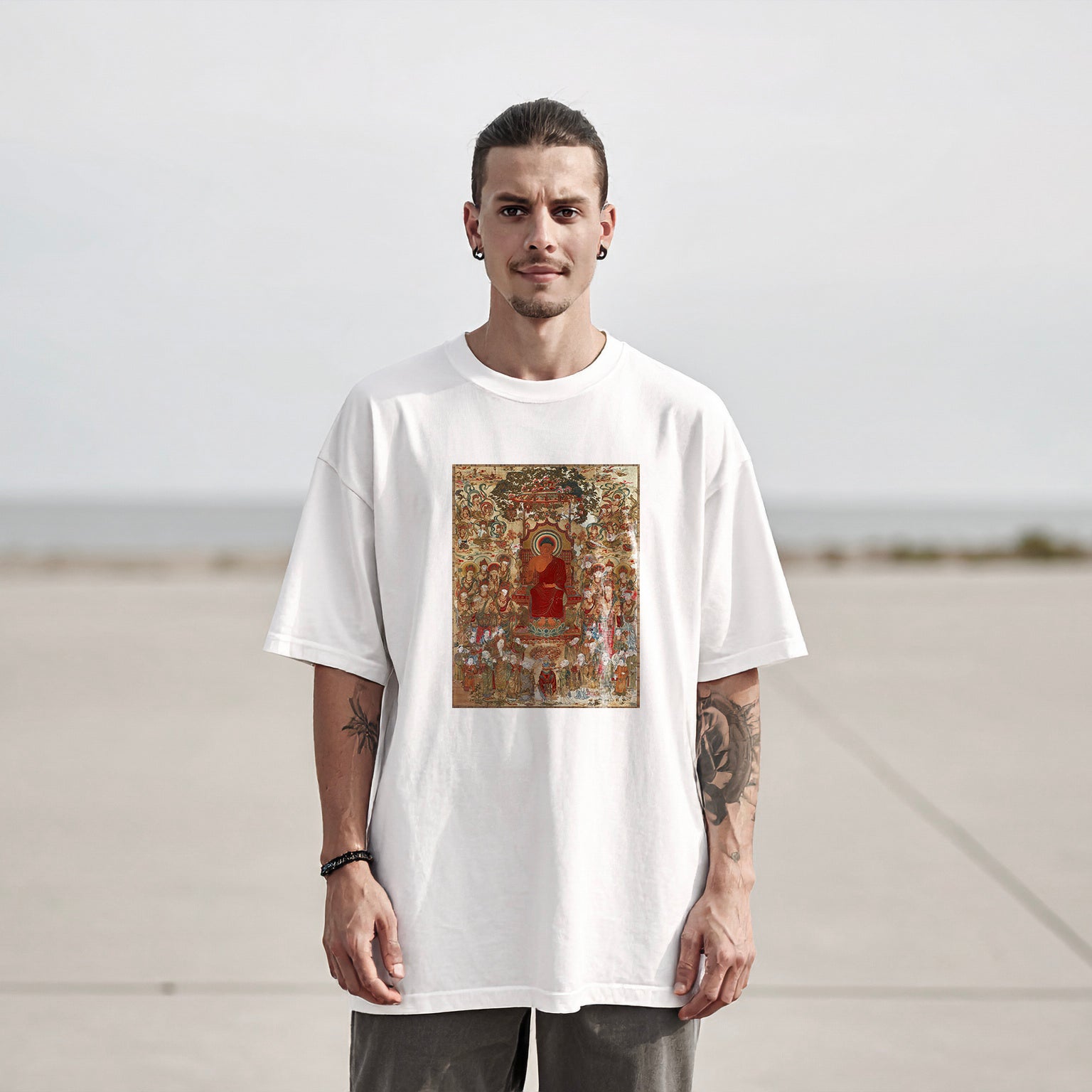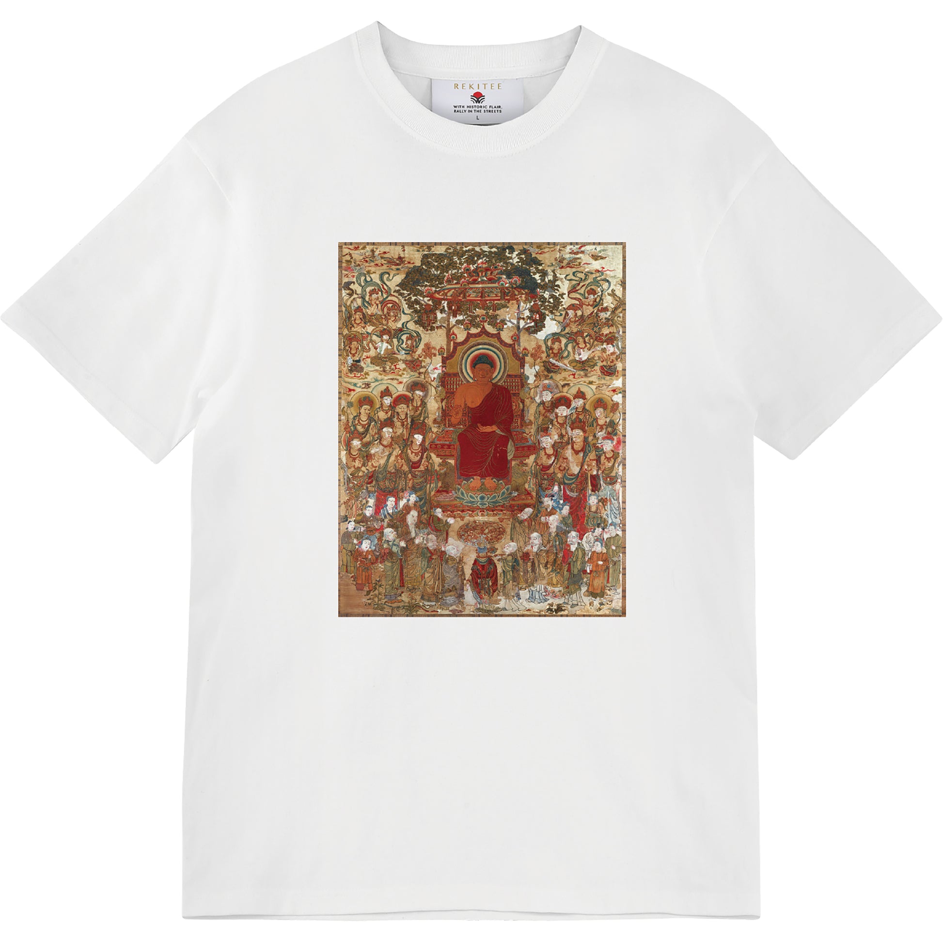 This embroidered Buddhist image from the 8th century is the largest surviving example of its kind in Japan. Created for memorial and devotional purposes, it depicts the Buddha giving a sermon, surrounded symmetrically by bodhisattvas, monks, devotees, and celestial beings. The use of colorful threads and fine stitching to express texture is especially notable.