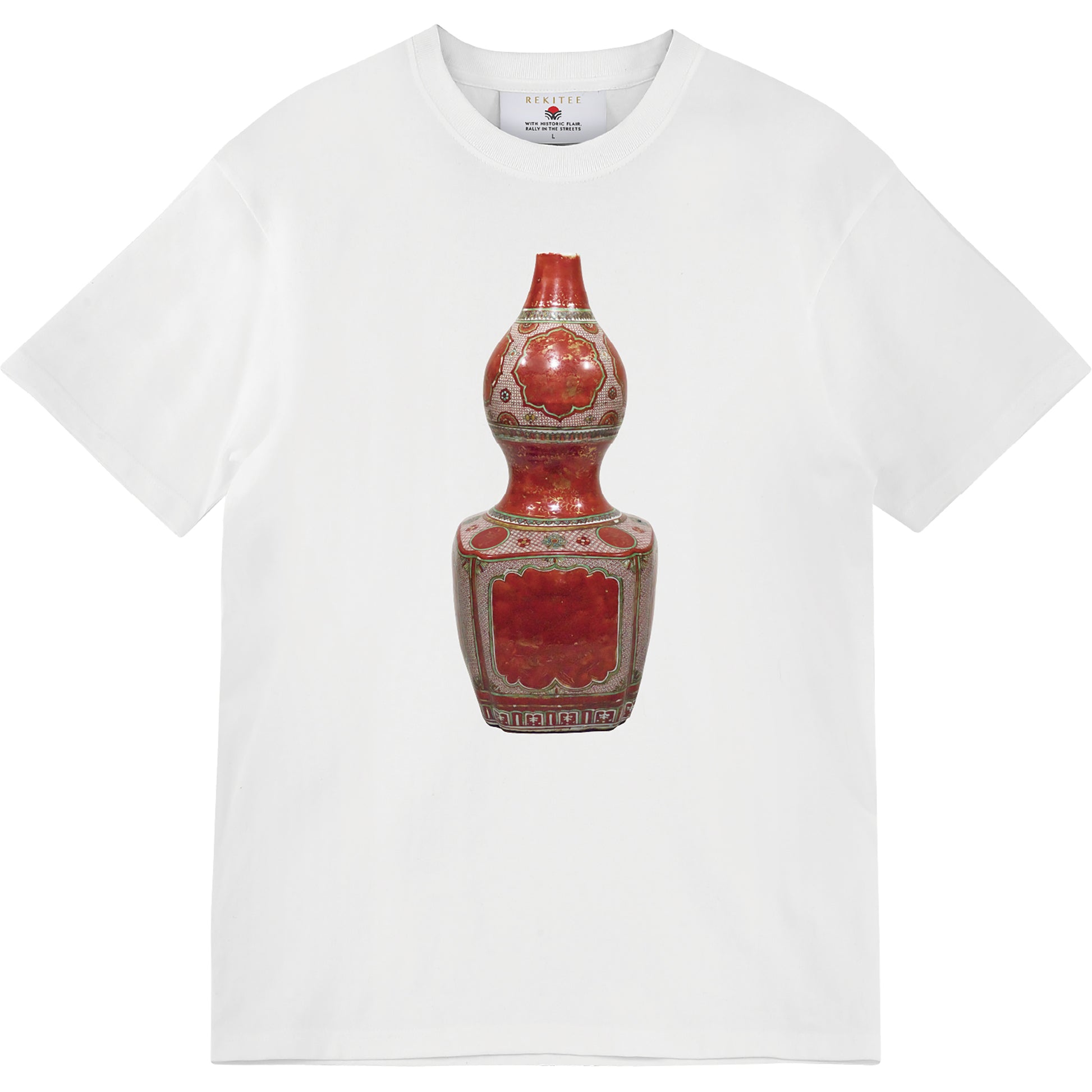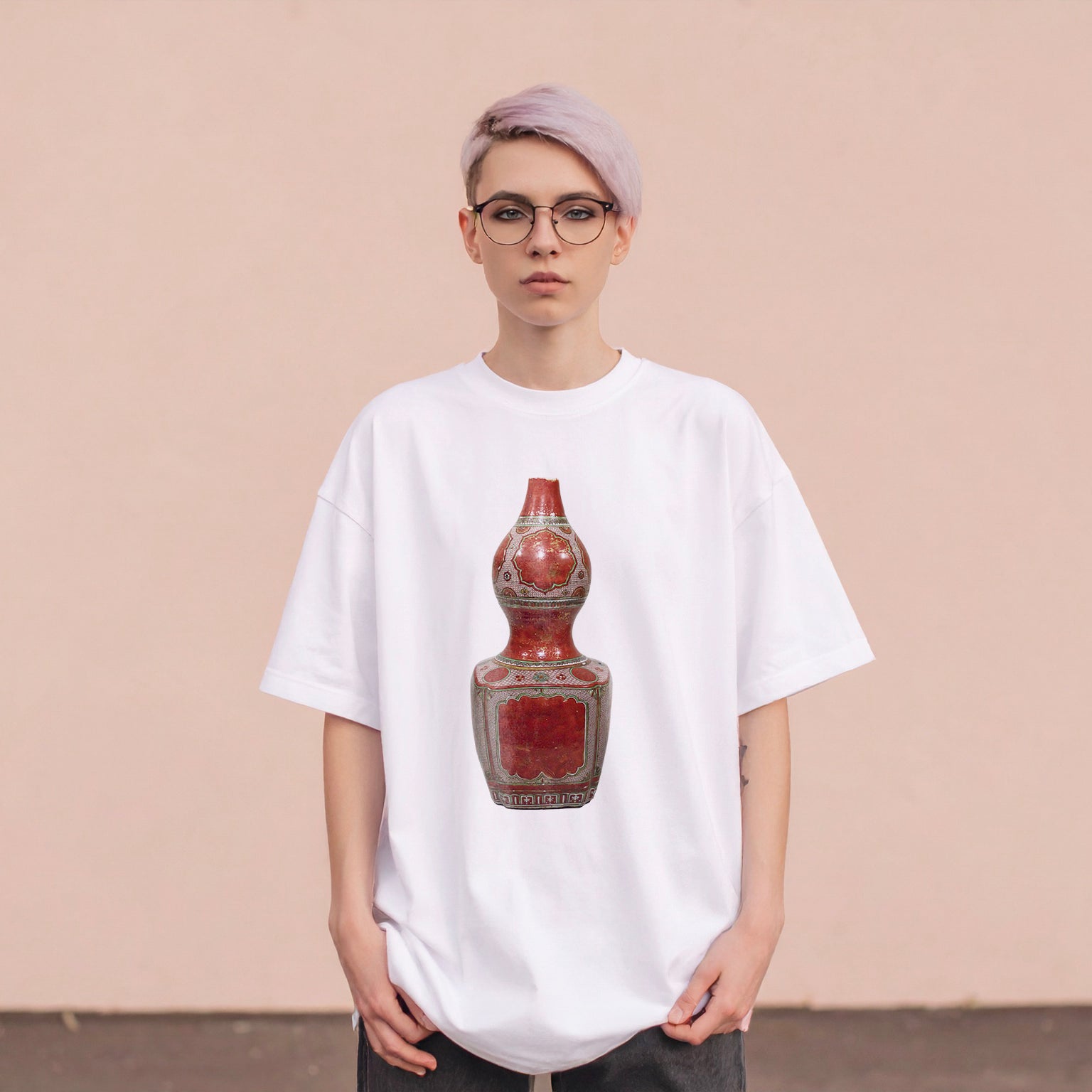 This porcelain vase, produced in the 16th century at Jingdezhen during China's Ming Dynasty, showcases the craftsmanship of this world-renowned kiln. The large, gourd-shaped vase has a square-shaped lower section, decorated with gold applied over colored designs. Circular medallions on the shoulders, each containing a single character inscribed in gold, further enhance its elegance and symbolic meaning.