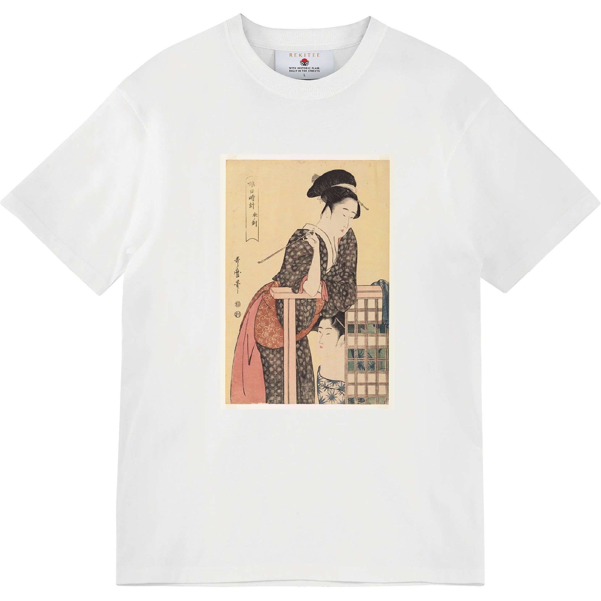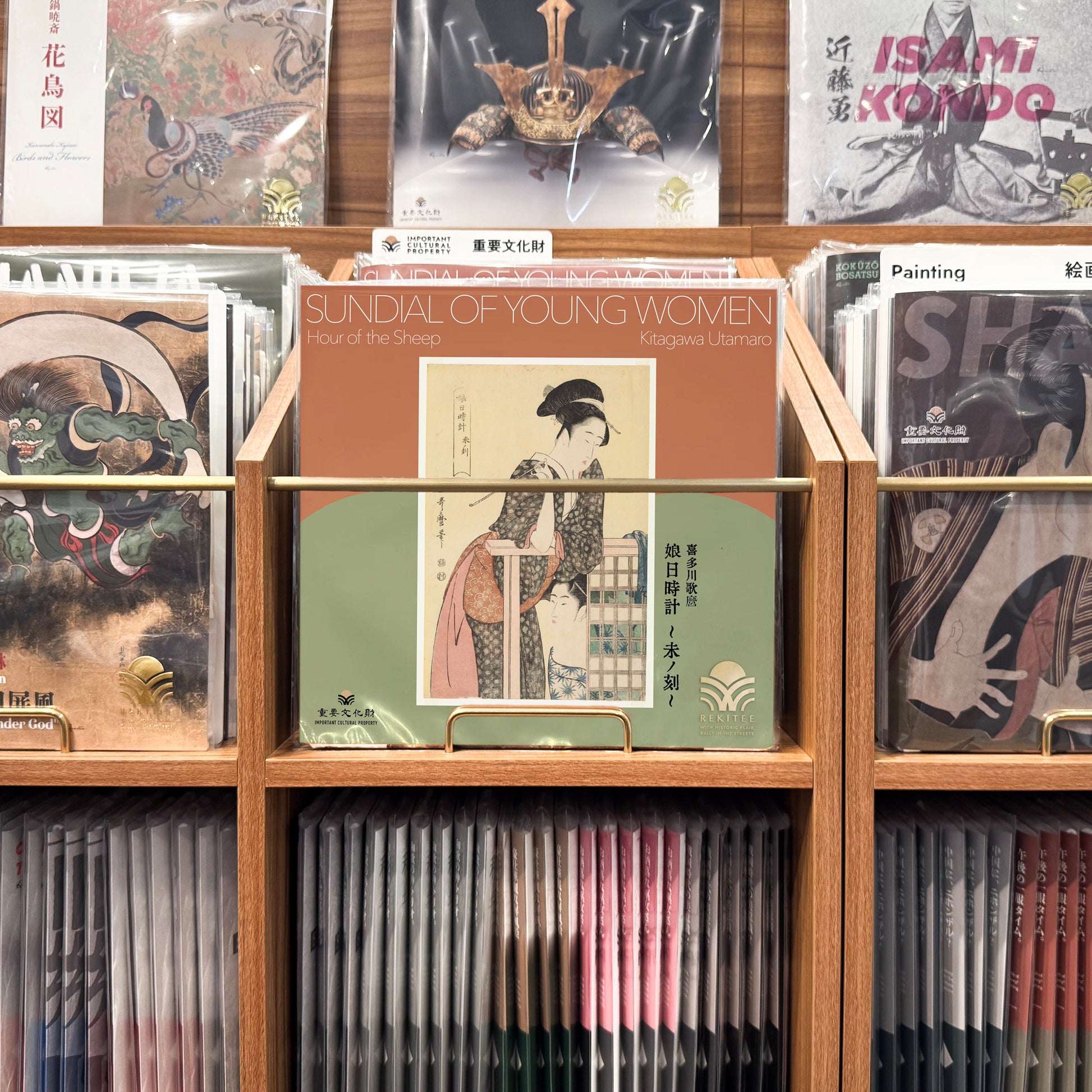 This is one of a series of five ukiyo-e prints depicting scenes from the daily life of townswomen, spanning from around 8 AM to 4 PM. The "Hour of the Sheep" refers to the time between 1 PM and 3 PM. It shows one woman reclining languidly against a screen, holding a long pipe, while another sits at her feet.