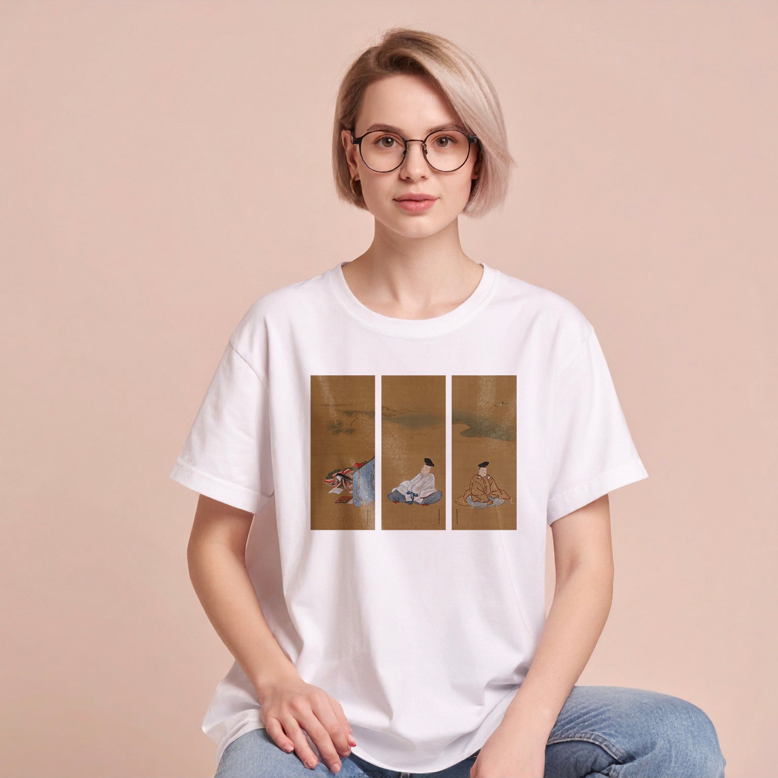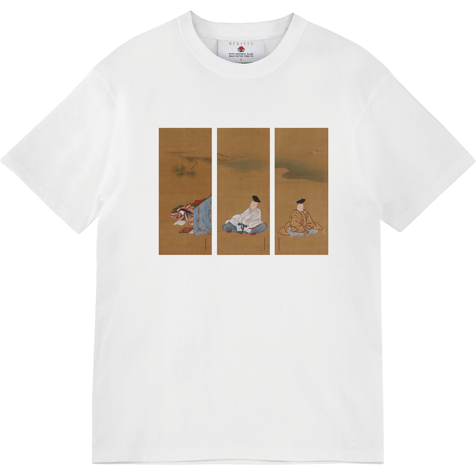 The painting depicts Tamatsushima-no-Kami, Kakinomoto no Hitomaro, and Yamabe no Akahito—figures often referred to as the "Three Saints of Japanese Poetry." Each is portrayed with a background inspired by scenes from their representative poems. Tamatsushima-no-Kami, in particular, is noted as a legendary beauty mentioned in Japan’s oldest historical records.