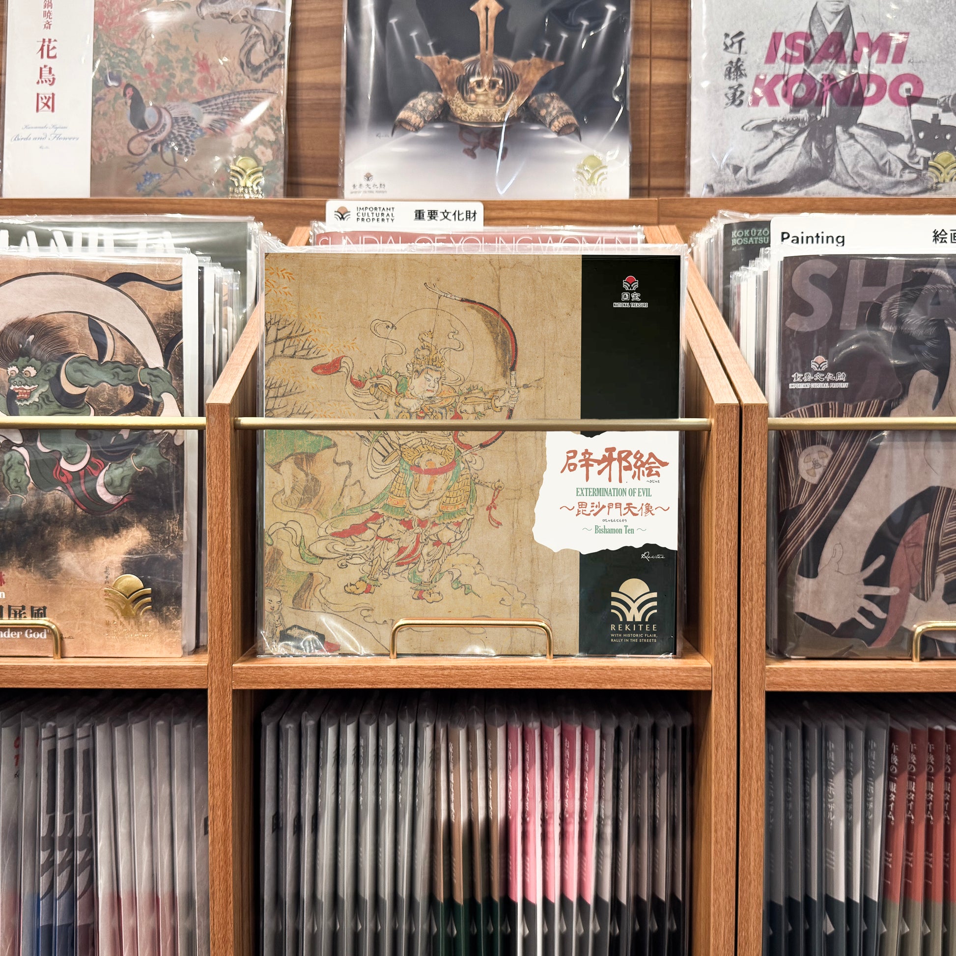This artwork depicts Bishamon Ten, who exterminates evil spirits that bring harm and illness. A Buddhist guardian of the north, he is also revered in Japan as a god of war. In this scene, Bishamon Ten appears on a cloud and shoots arrows at two demons attempting to interrupt a monk’s training. The demons flee in panic, but one in the rear is struck by an arrow.