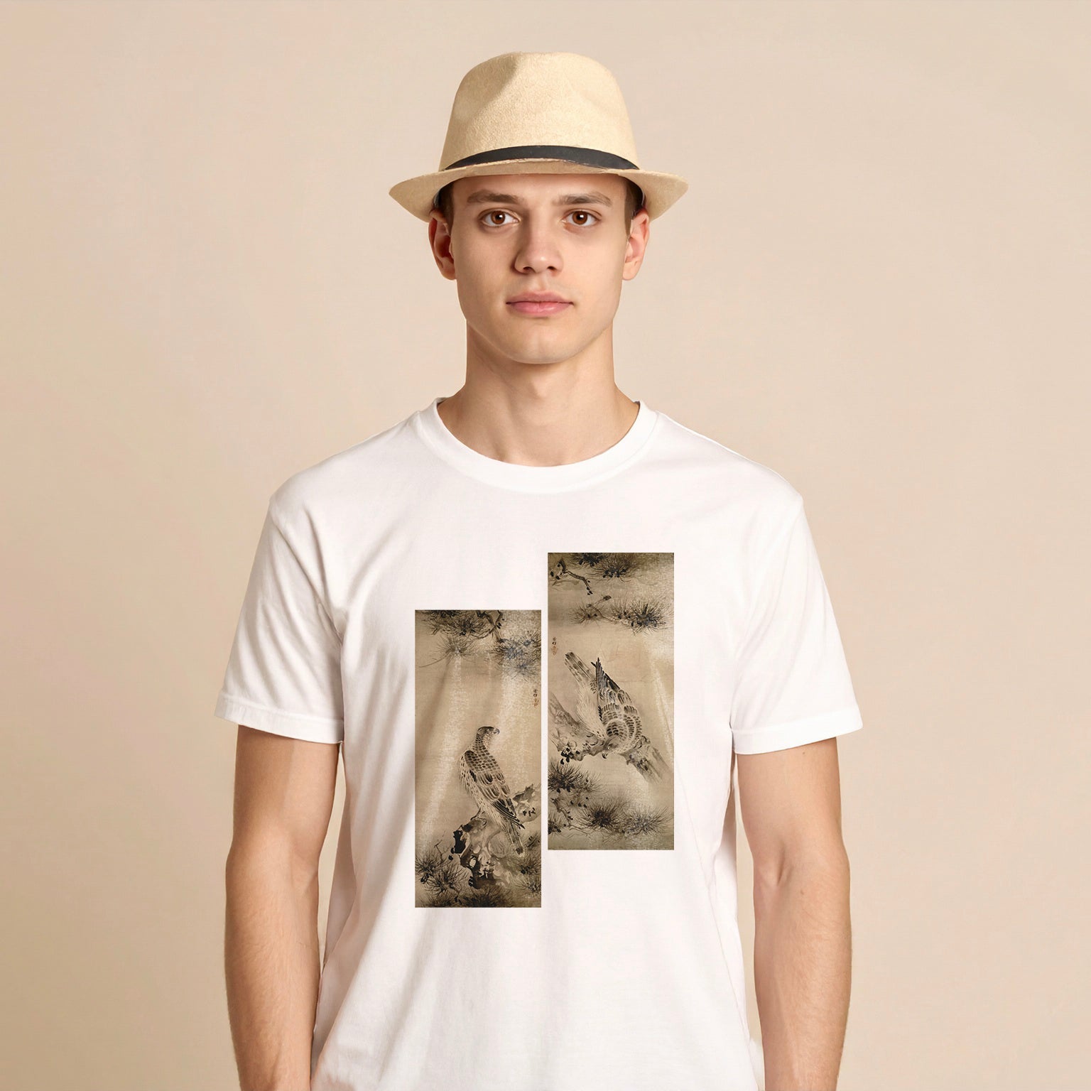 The pine tree symbolizes longevity and prosperity, while the falcon, an essential partner in falconry for the samurai, represents their warrior spirit. It was depicted as a symbol of martial success and career advancement, making it especially favored by the samurai class and frequently portrayed in various works of art. This piece skillfully employs subtle gradations of ink to delicately render the pine’s trunk, branches, and foliage, as well as the fine details of the falcon’s feathers.
