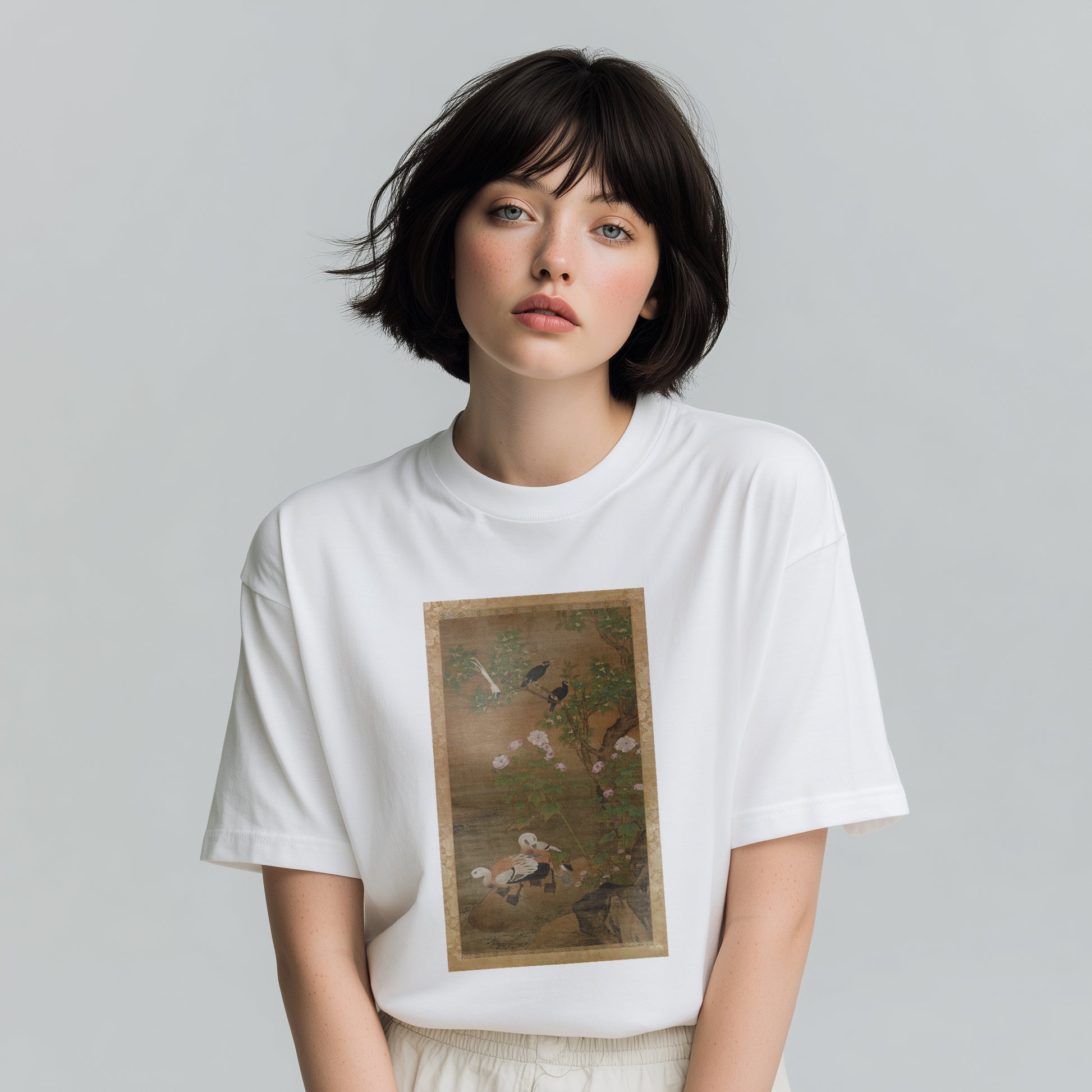 This work represents "Autumn" from a four-panel series themed on the four seasons. Chrysanthemums, fragrant olives, and cotton roses are depicted alongside mynas, ruddy shelducks, and paradise flycatchers, all arranged in an elegant and refined composition. Considered Lü Ji’s greatest masterpiece, it also influenced Japanese art from the Muromachi period onward.
